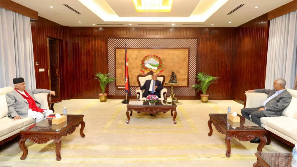 काठमाडौँ : प्रधानमन्त्री पुष्पकमल दाहाल, प्रमुख प्रतिपक्षी दल कांग्रेसका सभापति शेरबहादुर देउवा र सत्तारुढ एमालेका अध्यक्ष केपी शर्मा ओलीबीच भेटवार्ता भएको छ ।