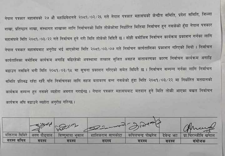 काठमाडौं- नेपाल पत्रकार महासंघको असार २२ गते शनिबारका लागि तोकिएको निर्वाचन कार्यक्रम अनिश्चितकालका लागि स्थगित गरिएको छ ।