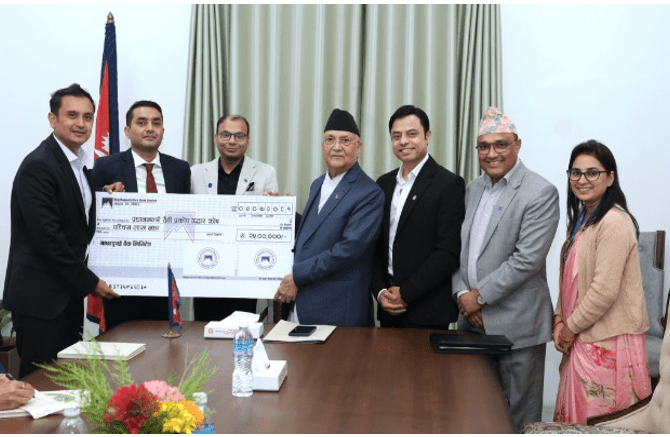 बैंककोे संस्थागत सामाजिक उत्तरदायित्व अन्तर्गत बैंकका अध्यक्ष रोशन के.सी.ले प्रधानमन्त्री केपी शर्मा ओलीलाई आइतबार २५ लाख रुपैयाँको चेक हस्तान्तरण गरेका हुन् ।